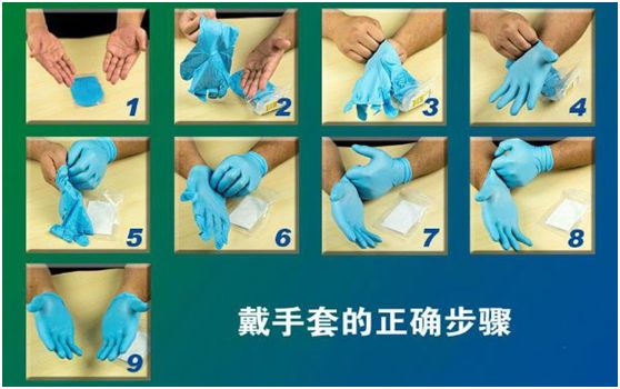 选取尺码合适的手套,打开手套包,一手捏住手套翻折部分(手套内面)取出手套,对准五指戴上。注:没有戴无菌手套的手,只允许接触手套套口的向外翻折部分,不能碰到手套的外表面。以戴着无菌手套的手指插入另一只手套的翻折内面,将手套戴好。已戴手套的手不可触碰另一只手的皮肤。将手套翻折部翻回实验服袖口。