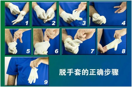 用一只手捏住另一只手套污染面的边缘将手套脱下。戴着手套的手握住脱下的手套,用脱下手套的手捏住另一只手套清洁面(内面)的边缘,将手套脱下。用手捏住手套的里面丢至废物容器内。