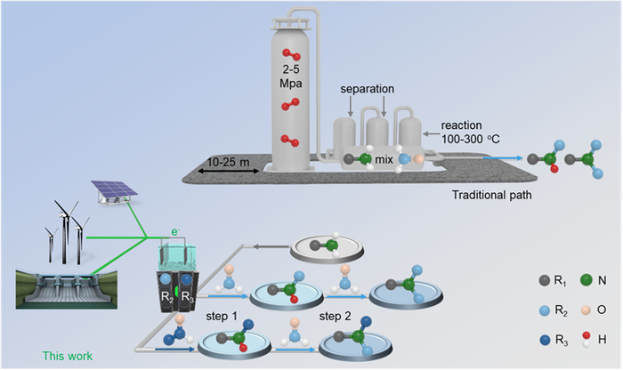 示意图1. 烷基胺的工业生产示意图(上图)及可编程电催化胺烷基化示意图(下图)。