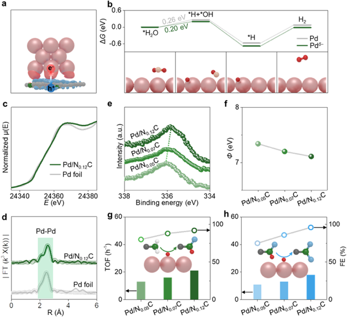 借助金属Pd和NxC载体(x为氮元素含量)之间的整流接触,通过调控NxC载体的N含量可以优化Pd金属中心的电子富集程度。如图2e-f所示,随着NC载体中N含量的增加,Pd 3d XPS谱图峰位置向低结合能位置偏移且整体催化剂功函值逐渐减小,XPS和功函值结果表明所负载Pd纳米粒子的富电子性显著增强。如图2g-h所示,更富电的Pdδ−(富电子Pd)电催化剂进一步提升了胺烷基化性能。
