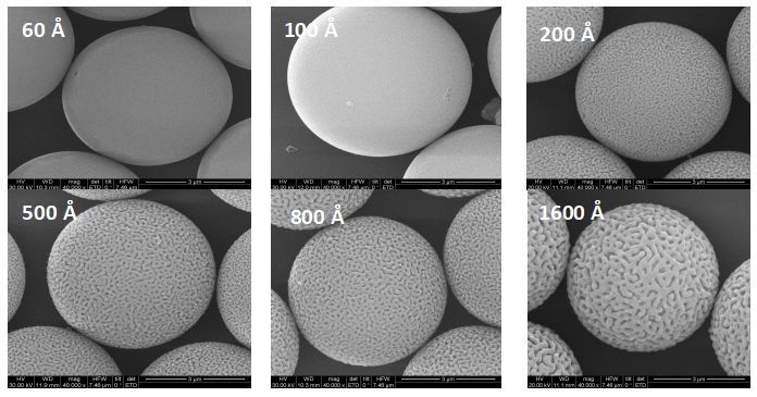 3.孔径,60A,120A,300A等。孔径小,则含孔率高,比表面积大,载碳量高;色谱柱填料孔径大小需和分子大小相匹配,保证分子自由进出填料孔并与孔内表面的键合相进行分离分配,通常要求孔径直径是分子直径的3倍以上,一般小分子使用80—120A,大分子使用300A。