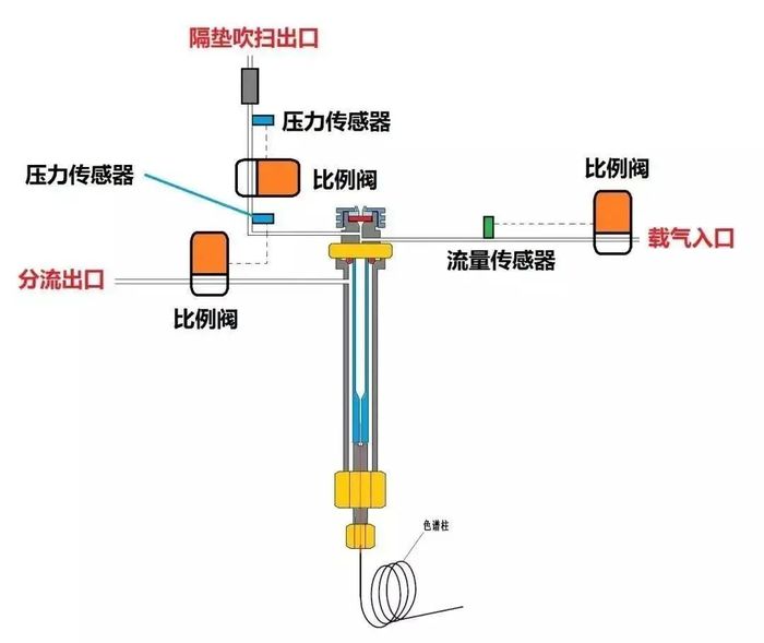 进入进样口的载气总流量由一个总流量阀控制,而后载气分成两部分:一是隔垫吹扫气(1~3mL/min),二是进入汽化室的载气