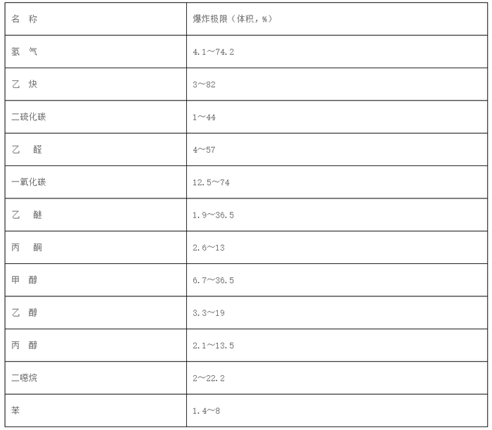 (5)易燃易爆气体如氢气、乙炔等烃类气体、煤气和有机蒸气等大量逸入空气,引起爆燃。常见易燃易爆物质蒸气在空气中爆炸极限见表1-3。