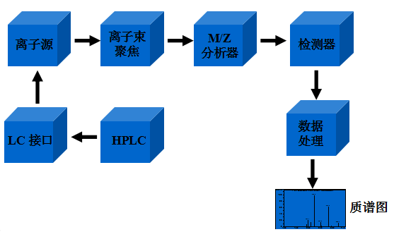 液质联用以液相色谱作为分离系统,质谱为检测系统。样品在质谱部分和流动相分离,被离子化后, 经质谱的质量分析器将离子碎片按荷质比分开,经检测器得到质谱图。