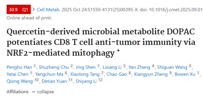 [1] Han P, Chu S, Shen J, et al. Quercetin-derived microbial metabolite DOPAC potentiates CD8+ T cell anti-tumor immunity via NRF2-mediated mitophagy. Cell Metab. 2025 Oct 24:S1550-4131(25)00395-X.