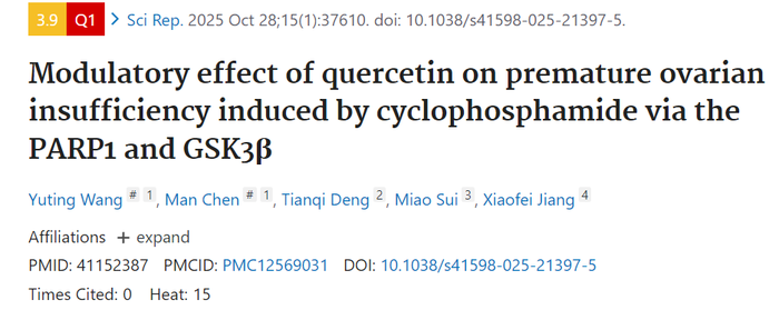 [3] Wang Y, Chen M, Deng T, et al. Modulatory effect of quercetin on premature ovarian insufficiency induced by cyclophosphamide via the PARP1 and GSK3β. Sci Rep. 2025 Oct 28;15(1):37610.