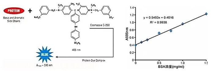 Bradford法原理是在酸性溶液中,考马斯亮蓝G250通过与蛋白质中的碱性氨基酸(精氨酸)和芳香族氨基酸残基相结合,使染料的最大吸收峰位置由488nm变为595nm,颜色从棕红色变为蓝色。结合到蛋白质分子上的染料数与蛋白所带正电荷成正比,通过颜色的强弱即可测定蛋白质浓度的高低,因此可以用该方法来对蛋白进行定量。