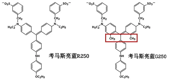 检测蛋白浓度的考马斯亮蓝和染色PAGE胶的考马斯亮蓝不是同一种物质,前者采用考马斯亮蓝G250,后者采用考马斯亮蓝R250;G250和R250分子基本骨架一样,但是G250多了两个甲基,与蛋白反应迅速,染胶慢且脱色困难,故用于蛋白定量;R250与蛋白反应较缓慢,染胶较快且易于洗脱,故用于PAGE胶染色。
