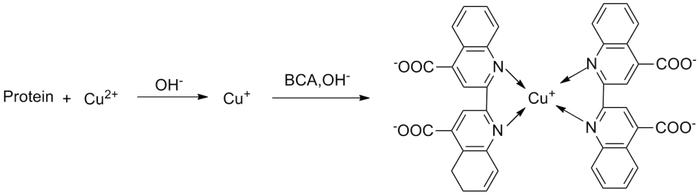 BCA(bicinchoninic acid,二辛可酸)法测定蛋白的原理:二价铜离子在碱性条件下可以被蛋白质还原成一价铜离子,一价铜离子和含有BCA的溶液相互作用产生敏感的颜色反应。两分子的BCA螯合一个铜离子,形成紫色的反应复合物。