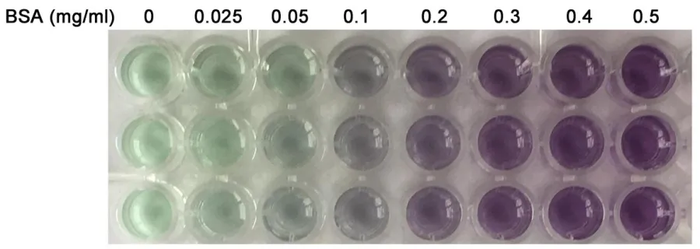 该水溶性的复合物在562nm处显示强烈的吸光性,吸光度和蛋白浓度在广泛范围内有良好的线性关系,并于标准曲线对比,因此根据吸光值可以推算出蛋白浓度。