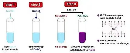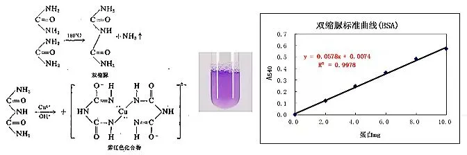 紫色络合物颜色的深浅与蛋白质的含量成正比,而与蛋白质的相对分子质量及氨基酸成分无关,故可用来测定蛋白质含量。测定范围1-10mg蛋白质。