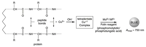 用于蛋白质测定的Lowry反应是双缩脲方法的发展,第一步涉及到在碱性溶液中铜-蛋白质复合物的形成(蛋白质中的肽键和铜离子结合产生双缩脲反应),Folin-酚试剂中的磷钼酸-磷钨酸试剂被铜-蛋白质复合物中蛋白质的酪氨酸和苯丙氨酸残基还原,产生深蓝色的钼蓝和钨蓝的混合物。在一定条件下,蓝色深度与蛋白的量成正比,由此可测定蛋白质的含量。