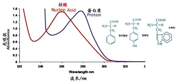 核酸对紫外光有很强的吸收,在280nm处的吸收比蛋白质强10倍,但核酸在260nm处的吸收更强,其吸收高峰在260nm附近。核酸260nm处的消光系数是280nm处的2倍,而蛋白质则相反,280nm紫外吸收值大于260nm的吸收值。