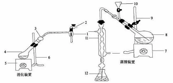 在消化完全的样品溶液中加入浓氢氧化钠使呈碱性,硫酸铵在碱性条件下释放出氨,通过加热蒸馏,氨随水蒸气蒸出:(NH₄)₂SO₄+2NaOH →2NH₃+Na₂SO₄+2H₂O