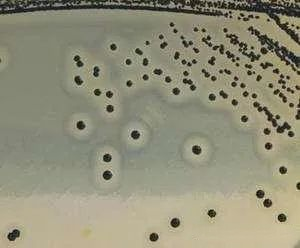 1.金黄色葡萄球菌在Baird-Parker平板上呈圆形,表面光滑、凸起、湿润、菌落直径为 2 mm~ 3mm,颜色呈灰黑色至黑色,有光泽,常有浅色(非白色)的边缘,周围绕以不透明圈(沉淀),其外常有一 清晰带。当用接种针触及菌落时具有黄油样黏稠感。有时可见到不分解脂肪的菌株,除没有不透明圈 和清晰带外,其他外观基本相同。从长期贮存的冷冻或脱水食品中分离的菌落,其黑色常较典型菌落浅 些,且外观可能较粗糙,质地较干燥。