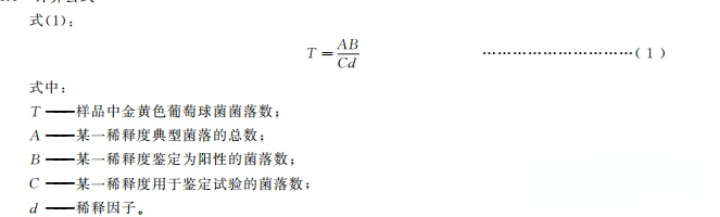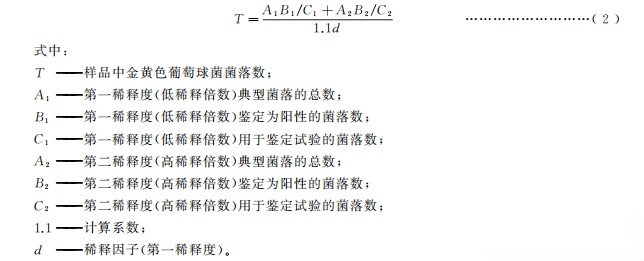根据上面的公式计算结果,报告每g(mL)样品中金黄色葡萄球菌数,以 CFU/g(mL)表示;如T 值为 0,则以小于1乘以最低稀释倍数报告。
