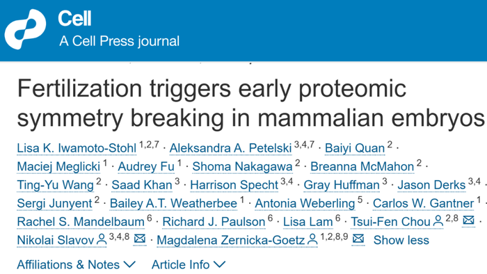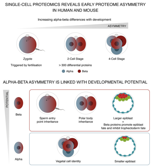 该研究使用单细胞和无标记质谱来检测小鼠和人类胚胎中单个卵裂球之间的蛋白质组学差异。研究人员早在受精卵和2细胞阶段就发现了惊人的蛋白质组不对称,揭示了卵裂球的两种可复制的蛋白质组状态,研究人员将其命名为α和β,以区分同一胚胎中的姐妹细胞。重要的是,这些早期蛋白质组差异预测了卵裂球的发育潜力,并与受精过程中精子进入的位置相关。该研究结果为小鼠和人类早期胚胎提供了一个单卵裂球全蛋白质组数据集,揭示了以前未被识别的由受精触发的蛋白质组预模式。这种预模式与发育潜力的差异有关,为对称破坏、细胞命运偏差和全能性丧失的分子起源提供了见解。