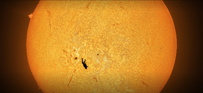 一名跳伞运动员纵身一跃,在太阳表面前留下了完美的剪影。画面背景中可见暗色的太阳黑子——这些区域源于强磁场阻挡了原本应上升至表面的部分热量。为了完成这张极具戏剧性的照片,天文摄影师Andrew McCarthy与跳伞运动员Gabriel Brown进行了长达数月的周密策划与精准时机把控,并借助一台专门设计的太阳望远镜,才得以捕捉到这一震撼瞬间。