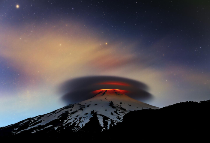夜幕降临时,智利比亚里卡火山喷涌而出的熔岩映亮了天空,两团近乎完美的环形云层在火光中浮现,构成了一幅奇异而壮观的画面。这一瞬间由摄影师Francisco Negroni捕捉。他长期定期前往这座火山,持续记录并监测其活动,用镜头见证火山的力量与美感。
