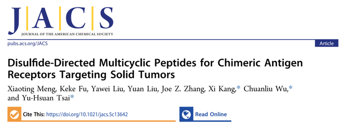 2026 年 1 月 2 日,深圳湾实验室分子生理学研究所蔡羽轩团队联合厦门大学吴川六教授、深圳湾实验室转化创新中心康曦研究员,在 Journal of the American Chemical Society 期刊发表了题为:Disulfide-directed multicyclic peptides for chimeric antigen receptors targeting solid tumors 的研究论文。