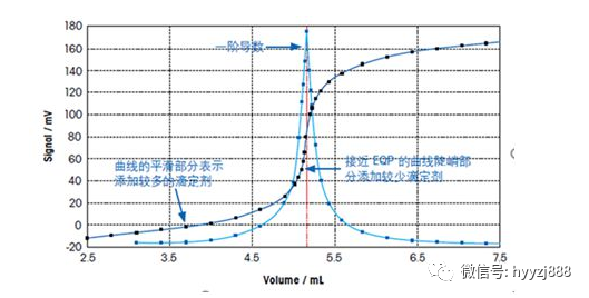 当样品中不断加入滴定剂,达到按照化学反应方程式的反应比例的摩尔量时,被测样品完全与滴定剂反应完全,反应终止。等当点即我们平时说的“拐点”、“突越点”或“转折点”。
