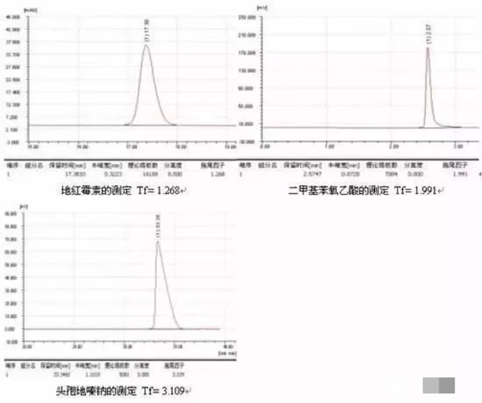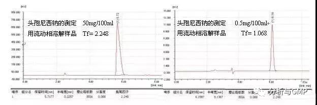 由于样品过载引起的峰形后拖不能通过改变色谱条件消除。如果发现过载,需降低进样量(包括进样体积或浓度),进样量越小,峰形越好,例子如头孢尼西钠的测定: