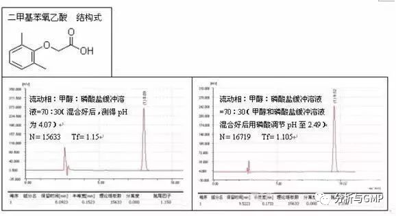 将流动相的pH调至比弱酸pKa小2以上,比弱碱pKa大2以上,可有效抑制易离子化待测物的电离,从而取得良好峰形。例子如二甲基苯氧乙酸的测定: